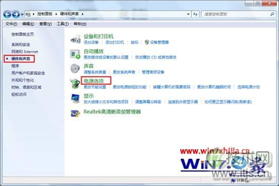 2、节省在打开的电及控制面板中,选择点击“硬件和声音”;