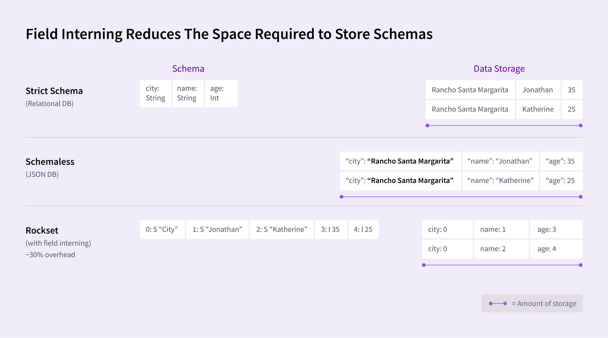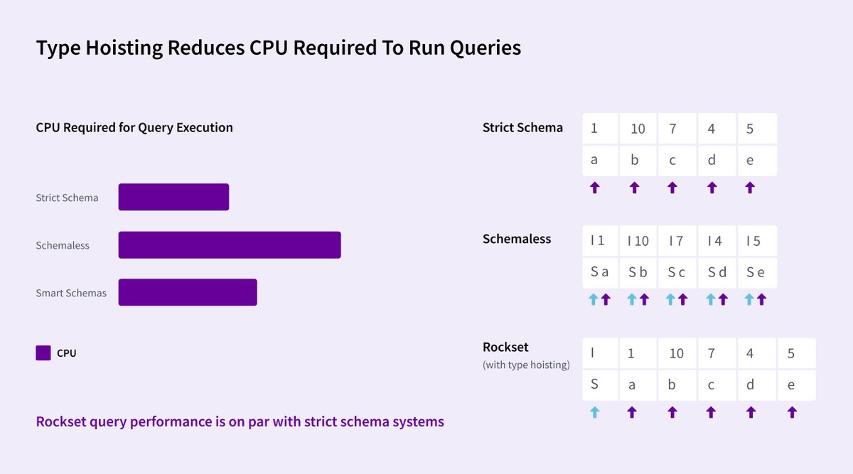 Rockset使用了一种叫做类型提升的东西来减少查询的处理时间。具有相同类型的相邻项目可以将其类型信息提升到适用于整个项目集,而不是存储在列表中的每一个单独的项目。这使得矢量的CPU指令能够快速处理整个项目集。这个实现--连同我们的 Converged Index™--使Rockset查询能够像具有刚性模式的数据库一样快速运行,而不会产生额外的计算。