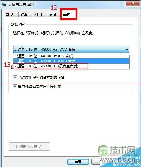 3、双击【立体声混音】--【级别】,将下面的服务器租用音条拖到最大。选择【高级】,选择【录音室质量】。如图: