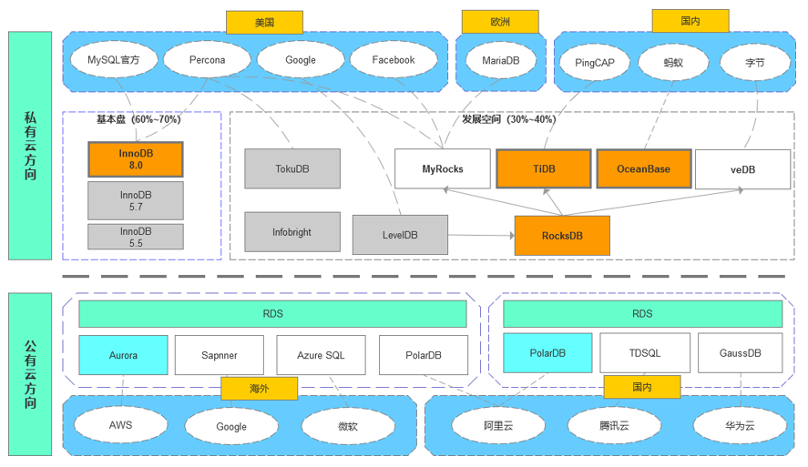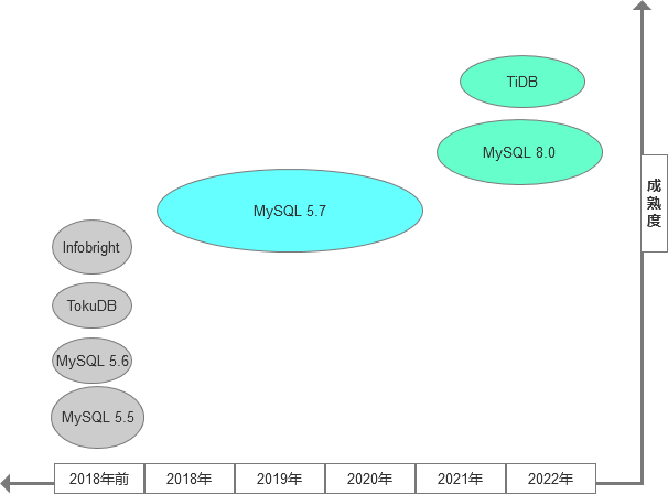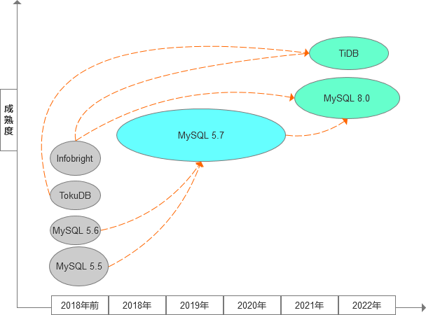 在这些因素的基础之上,我们以点带面展开分析,发现多分支技术栈散乱只是表象,还有一些潜在问题和瓶颈问题: 1、MySQL版本过旧,架构管理不一致,运维复杂度较高1) MySQL 5.5和5.6为过旧技术栈,官方已不再维护 2) 未来3年内需要从MySQL 5.7升级至8.0,演进复杂度高 3) 40%操作系统版本过旧,后续的数据库版本升级存在风险 2、部分技术栈已闭源,服务异常时存在恢复风险1) Infobright已转为商业版维护 2) TokuDB已于2020年不再维护 3、数据库规范和审核机制难以支撑现有的业务需求1) SQL审核工具解决了早期的研发规范问题,后续闭源难以持续 2) 数据库开发规范已4年未更新,部分开发规范已难以满足业务需要 4、人员稳定性和持续发展1)DBA不可避免地在做一些重复劳动,一些繁琐的差异化操作势必会削弱工作热情,也会发生一些意料之外的异常 2)个人运维经验无法有效的沉淀转化 所以这是一个综合的问题,涉及到对技术、业务和人的管理,而且是环环相扣。 当然对于一件事情的基本逻辑越简单,实现起来也更聚焦。所以我们进一步提炼了一下目标,7->2,即7个分支技术栈整合为2个,在这个基础上进行生态技术栈的补充和完善。 (三)数据库版本升级的意义做这件事情有什么好处呢,也就是所谓的意义,我觉得是:降本增效,提高整体业务稳定性。主要体现在如下六个方面: 应对未来3年内的数据库基础服务风险,对后续的数据存储平台架构迭代奠定基础(这个需要由明确的规划支撑)通过版本升级提高整体业务性能和稳定性实现支持系统的一致性,提高基础服务支撑能力将单点业务迁移至MySQL主流技术栈,预防故障风险对开发规范和SQL审核机制进行规范化支持和落地为后续的环境标准化建设提供实践经验我从公有云和私有云的视角盘点了下MySQL技术栈发展的情况,其实MySQL 8.0已经成为了行业主流的基线版本,各种数据库产品层出不穷,如果基线版本已经落后了,后续势必会有整合和返工,所以这也算是一个技术的战略点。在协议兼容的前提下,还需要进一步考虑到国产化数据库的影子,当然也可以有更多的选择,重心在于协议和生态技术栈兼容。