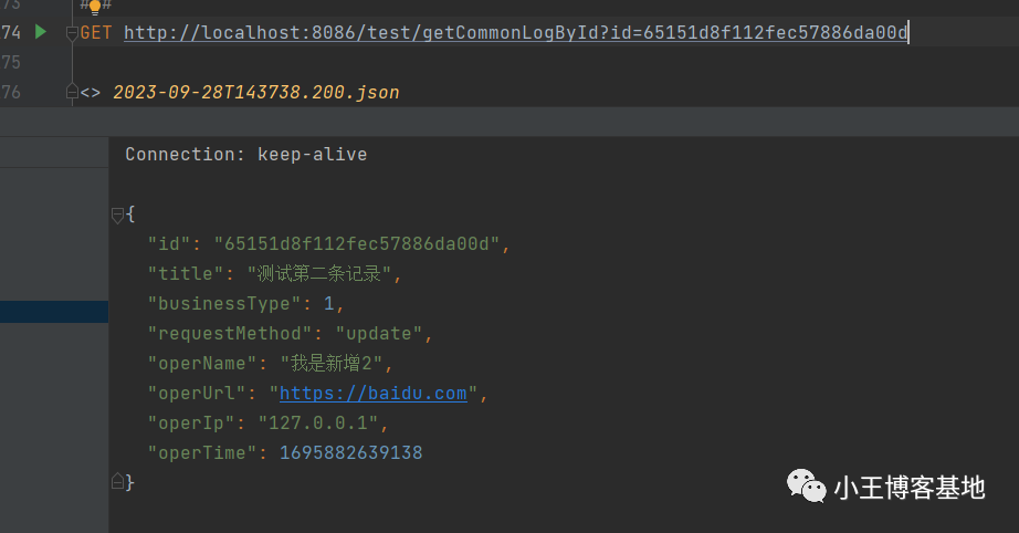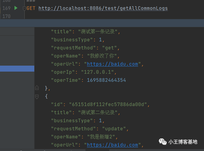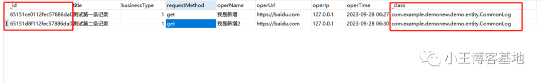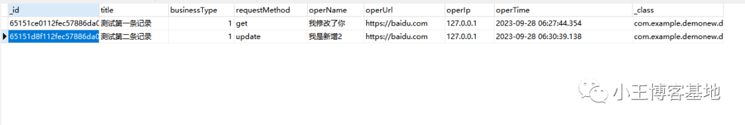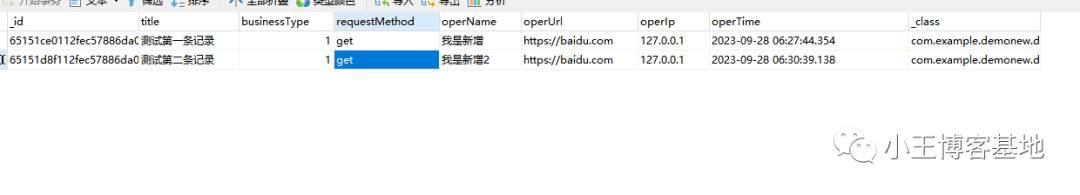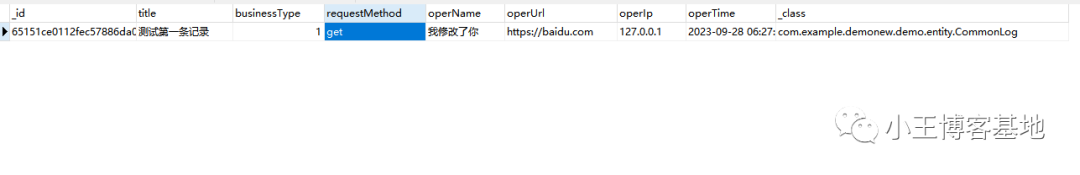 这里分为两种使用形式,一种是直接使用MongoTemplate,第二种就是extends MongoRepository<MyDocument, String>,来实现各种API。 这两种方式没有什么区别,不想写一个接口来继承的话,直接使用template也是没问题的! 「制定了MongoRepository<CommonLog, String>就不需要每次操作的时候指定,像MongoTemplate就需要每次操作来指定是那个类。」 我们以第一种来使用,当然第二种的使用也给大家参考: 复制public interface CommonLogRepository extends MongoRepository<CommonLog, String> { }1.2.4、CRUD操作简单的写在Controller里了 「新增如果数据库中不存在文档就会自动新增并把记录插入,还是很智能的!」 「新增:」 复制private final MongoTemplate mongoTemplate; @PostMapping("saveCommonLog") public CommonLog saveCommonLog() { CommonLog commonLog = new CommonLog(); commonLog.setOperIp("127.0.0.1"); commonLog.setBusinessType(1); commonLog.setOperUrl("https://baidu.com"); commonLog.setOperName("我是新增"); commonLog.setTitle("测试第一条记录"); commonLog.setRequestMethod("get"); commonLog.setOperTime(new Date()); return mongoTemplate.save(commonLog); }1.2.3.4.5.6.7.8.9.10.11.12.13.14.