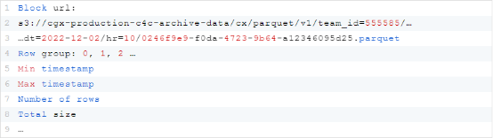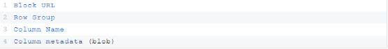 此外,它们为每个Parquet文件存储列元数据。比如说: