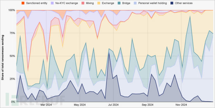 快速变化的赎金洗钱环境 来源:Chainalysis Chainalysis表示,混币服务正在被抛弃,转而使用跨链桥来混淆交易并逃避追踪。2024年,中心化交易所仍然是主要的套现方式,39%的勒索软件收益通过它们进行套现。 最后,Chainalysis指出,企商汇越来越多的附属机构选择将勒索软件收益存放在个人钱包中,并因担心被追踪和逮捕而犹豫是否套现。  |