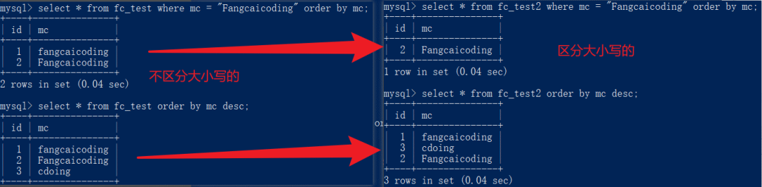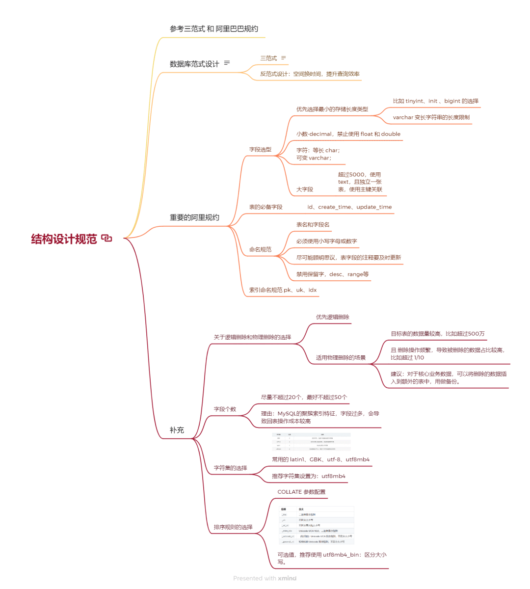 image-20250122151028028 如果你需要存储更大字节的内容,就可以使用``LONGTEXT 类型,最大列长度为 4,294,967,295 字节;或者 使用二进制大文件LONGBLOB` 类型,最大列长度为 4,294,967,295 字节。注意:对于字符串字段,若长度超过5000,就建议使用text类型,且独立出来一张表,用主键来对应,避免影响其它字段索引效率(后续讲解了聚簇索引就可以理解为什么了)。在我们当前这个示例中,使用varchar即可: 复制`kjkm_bm` varchar(64) NOT NULL COMMENT 会计科目编码-冗余字段,便于查询,1. 日期和时间类型MySQL 的日期和时间类型,包括 DATE、TIME、DATETIME、TIMESTAMP 以及 YEAR。 DATE 类型只包含日期部分,不包含时间部分。DATE 类型的格式为 YYYY-MM-DD,支持的范围是 0000-01-01 到 9999-12-31。TIME 类型的格式为 HH:MM:SS[.fraction],支持的范围是 -838:59:59.000000 到 838:59:59.000000。DATETIME 类型是日期和时间的组合,格式为 YYYY-MM-DD HH:MM:SS[.fraction]。支持的范围是 0000-01-01 00:00:00.000000 到 9999-12-31 23:59:59.999999。TIMESTAMP 类型是日期和时间的组合,支持的范围是 UTC 时间从 1970-01-01 00:00:01.000000 到 2038-01-19 03:14:07.999999。注意:a.范围上限问题:TIMESTAMP 数据类型受 2038 年问题的影响。如果存储的值大于 2038,需使用 DATETIME 类型。 b.时区的问题:当存储 TIMESTAMP 时,MySQL 会将当前时区的 TIMESTAMP 值转换为 UTC 时区。当读取 TIMESTAMP 时,MySQL 将存储的 TIMESTAMP 值从 UTC 时区转换为当前时区(DATETIME` 不会这样处理)。 YEAR 类型的格式为 YYYY,支持的值范围是 1901 到 2155,也支持零值 0000。所以,方才建议,日期和时间类型字段,优先选用DATETIME,同时要合理利用其自动初始化或更新为当前时间的特性,比如说创建时间和更新时间: 复制`created_time` datetime NOT NULL DEFAULT CURRENT_TIMESTAMP COMMENT 创建时间, `updated_time` datetime NOT NULL DEFAULT CURRENT_TIMESTAMP ON UPDATE CURRENT_TIMESTAMP COMMENT 更新时间,1.2.逻辑删除与物理删除什么是物理删除?什么是逻辑删除? 物理删除:把数据从硬盘中删除,可释放存储空间逻辑删除:给数据添加一个字段,比如is_deleted,以标记该数据已经逻辑删除。根据方才的经验,建议是优先采用逻辑删除。更方便去最终一些问题或者手动回滚数据等。 但若满足以下场景,是更适合使用物理删除的: 目标表的数据量较高,比如超过500万;且删除操作频繁,导致被删除的数据占比较高,比如超过 1/10;建议:对于核心业务数据,且无法通过其他数据派生而来,可以将删除的数据插入到额外的表中,用做备份。这个场景下,无用的数据太多,会影响到查询和更新的效率了。 而刚好,会计科目余额表就符合这个场景,数据量超10亿,凭证更新会导致数据的频繁覆盖写入,同时本身数据就是可以通过期初数据+凭证数据计算得来,所以可以看到kjkm_fse这个表是没有is_deleted字段的。 字段个数个人建议表中字段尽量不超过20个,最多不超过50个。 理由是:因为MySQL的聚簇索引特征,过多的字段会导致回表操作成本过高,影响查询性能。 字符集的选择字符集影响的是字符串类型的存储,包括能否存储以及一个字符对应的字节长度。 MySQL 支持的字符集有utf8、utf8mb4、GBK、latin1等。 latin1:MySQL 默认字符集,1 个字节长度,所以容易出现乱码问题;GBK :支持中文,但是不支持国际通用字符集,2 个字节长度;utf8:支持中英文混合场景,国际通过,3 个字节长度;utf8mb4: 完全兼容 utf8,4 个字节长度,可存储更多的字符;方才推荐字符集优先选择utf8mb4,支持更广泛的字符集范围,通过建表语句 CHARSET=utf8mb4可以指定。 复制ENGINE=InnoDB DEFAULT CHARSET=utf8mb4 COLLATE=utf8mb4_bin AUTO_INCREMENT=1 COMMENT=会计科目-发生额 PARTITION BY HASH (`zt_id`) PARTITIONS 3;1.2.排序规则的选择排序规则会影响对字符类型的排序以及查询,是非常重要的,一不小心就容易出现bug,且很难定位。 一个字符集可以有多种排序规则。排序规则的命名格式为 <character_set>_<collation_properties>。例如,utf8mb4 字符集有一个名为 utf8mb4_bin 的排序规则,它是 utf8mb4 字符集的二进制排序规则。下表是常见字符集和排序规则的后缀和含义: 后缀 含义 _bin 二进制排序规则,区分大小写 _ci 不区分大小写 _ai_ci 不区分重音和大小写 _0900_bin Unicode UCA 9.0.0,二进制排序规则 _unicode_ci (较旧的)Unicode UCA 排序规则,不区分大小写 _general_ci 较宽松的 Unicode 排序规则,不区分大小写 简单看两个示例就会理解深刻了。 下面这个示例,通过COLLATE=utf8mb4_general_ci 和COLLATE=utf8mb4_bin分别设置不同的排序规则: 复制CREATE TABLE`fc_test` ( `id`bigint(20) UNSIGNEDNOTNULL AUTO_INCREMENT COMMENT主键, `mc`varchar(64) NOTNULLCOMMENT名称, PRIMARY KEY (`id`) ) ENGINE=InnoDBDEFAULTCHARSET=utf8mb4 COLLATE=utf8mb4_general_ci COMMENT=不区分大小的测试; INSERTINTO fc_test( mc) VALUES(fangcaicoding),(Fangcaicoding),(cdoing); CREATETABLE`fc_test2` ( `id`bigint(20) UNSIGNEDNOTNULL AUTO_INCREMENT COMMENT主键, `mc`varchar(64) NOTNULLCOMMENT名称, PRIMARY KEY (`id`) ) ENGINE=InnoDBDEFAULTCHARSET=utf8mb4 COLLATE=utf8mb4_bin COMMENT=区分大小的测试; INSERTINTO fc_test2 ( mc) VALUES(fangcaicoding),(Fangcaicoding),(cdoing);1.2.3.4.5.6.7.8.9.10.11.12.13.14.15.16.17.18.查询和排序下: 复制-- 不区分大小写 select * from fc_test where mc = "Fangcaicoding" order by mc; select * from fc_test order by mc desc; -- 区分大小写 select * from fc_test2 where mc = "Fangcaicoding" order by mc; select * from fc_test order by mc desc;1.2.3.4.5.6.运行截图如下: