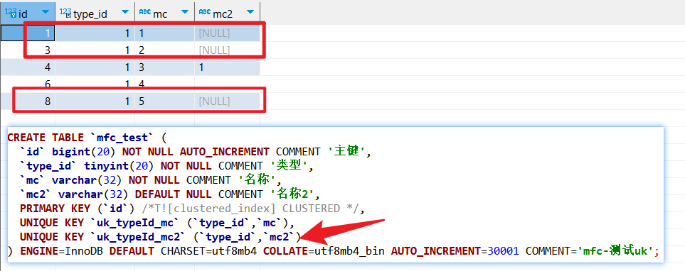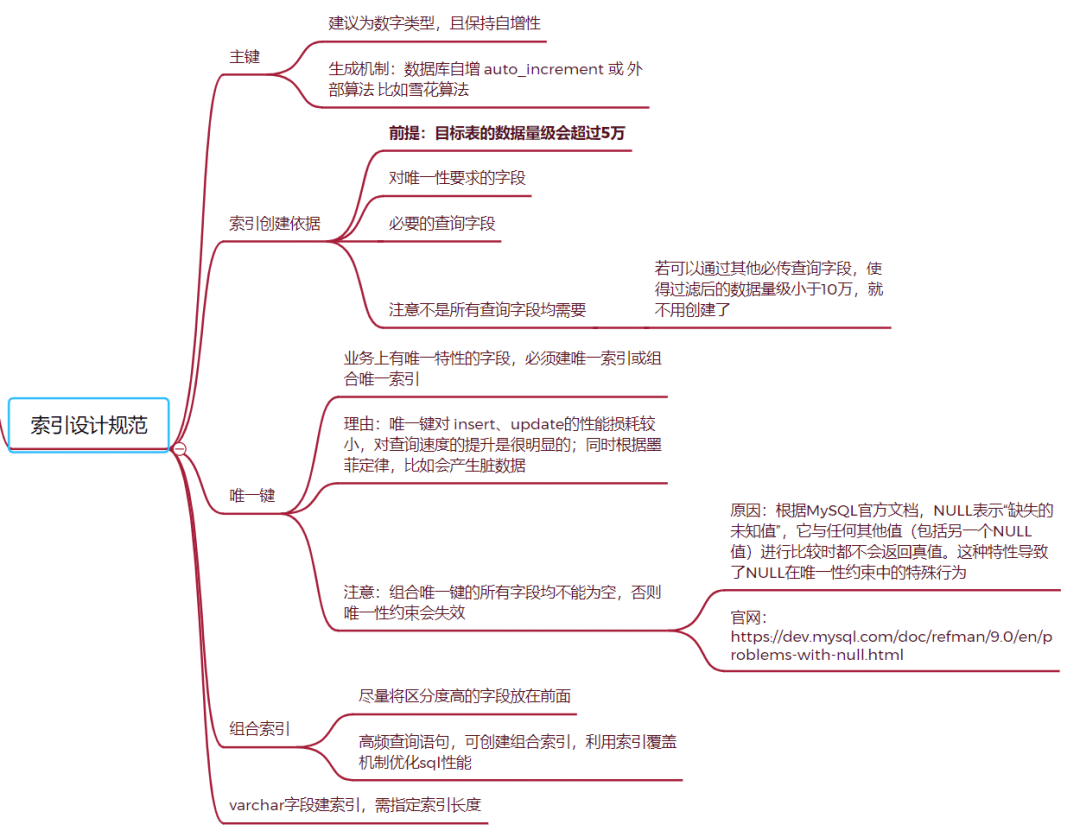 结合上面的脑图,针对kjkm_fse这个表,我们来一一分析下。 关于主键方才建议所有的表均应该有主键,优先为数字类型,且保持自增性(若是辅助表,主键可以直接使用主表的)。 常用的主键生成机制有: 数据库自增 auto_increment ;基于外部算法代码实现:比如雪花算法、百度Uid-Generator、美团Leaf等;在kjkm_fse表是有自增id的,但因为数据量较大,使用了分区表(关于TiDB的分区表,大家若有兴趣,可以在评论区告诉方才哟),分区字段按规范需要作为主键的组合字段之一,所以该表的主键如下: 复制-- 省略了无效内容 CREATE TABLE `kjkm_fse` ( `id` bigint(20) UNSIGNED NOT NULL AUTO_INCREMENT COMMENT 主键 PRIMARY KEY (`id`,`zt_id`) ) PARTITION BY HASH (`zt_id`) PARTITIONS 3;1.2.3.4.5.补充:如果一个表没有显示定义主键: MySQL的 InnoDB 引擎会尝试使用第一个非空的唯一索引(NOT NULL 和 UNIQUE INDEX)作为聚簇索引。如果没有合适的唯一索引,InnoDB 会自动生成一个隐藏的 ROW_ID 列作为聚簇索引,这个隐藏列是递增的。TiDB数据库,如果表没有主键,TiDB 会自动生成一个隐式的 _tidb_rowid 列作为行 ID。这个列的值是单调递增的。索引创建依据除了主键建议均有,其他索引的创建,是需要跟进实际情况进行判断的,方才总结规则如下: 前提:目标表的数据量级会超过10万;对唯一性要求的字段;必要的查询字段;索引不是越多越好,过多的索引,会影响数据更新效率,同时会导致sql的自动优化出现非预期行为;注意不是所有查询字段均需要:若可以通过其他必传查询字段,使得过滤后的数据量级小于10万,就可以不用创建;唯一索引方才建议,业务上有唯一特性的字段,必须建唯一索引或组合唯一索引: 理由:唯一键对 insert、update的性能损耗较小,对查询速度的提升是很明显的;同时根据墨菲定律,比如会产生脏数据 一定要注意:组合唯一键的所有字段均不能为空,否则可能导致唯一键约束失效。 原因:根据MySQL官方文档,NULL表示“缺失的未知值”,它与任何其他值(包括另一个NULL值)进行比较时都不会返回真值。这种特性导致了NULL在唯一性约束中的特殊行为。效果直接看下面的示例截图就知道了,uk_typeId_mc2 是没有锁住的,数据1-3-8在逻辑上都是重复的: