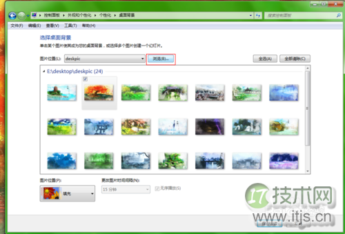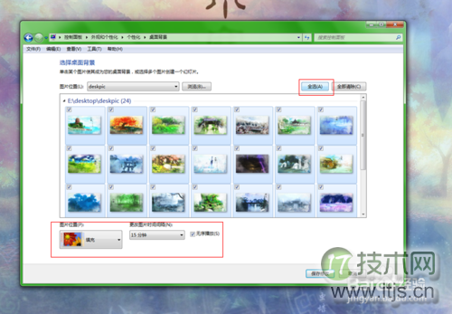 5、这是系统会读取文件里的一张设置成你的桌面,如何让文件里全部图片轮播呢?点击一下“全选”,网站模板让系统勾选你文件里的全部图片,”图片位置“,“图片间隔时间”可根据需要选择,如图7;到此设置完成。假如你想将这些保存成主题,只需如图8,选择保存主题,命名主题,即可。