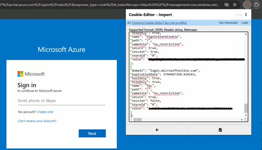 窃取 Cookie 后,攻击者可通过合法工具如“Cookie-Editor”Chrome 扩展,将其导入自己的浏览器,伪装成受害者身份。