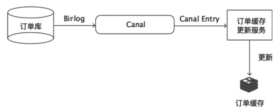 图2订阅Binlog更新缓存的结构 订阅Binlog更新缓存的方案,相较于上文中接收消息更新Redis缓存的方案,两者的实现思路其实是一样的,都是异步实时订阅数据变更信息以更新Redis缓存。只不过,直接读取Binlog这种方式,通用性更强。该方式不会要求订单服务再发送订单消息,订单更新服务也不用额外考虑如何解决“消息发送失败了该怎么办?”这种数据一致性问题。 除此之外,由于在整个缓存更新链路上,减少了一个收发消息队列的环节,从MySQL更新到Redis更新的时延变得更短,出现故障的可能性也更低,因此很多大型互联网企业更青睐于采用这种方案。 订阅Binlog更新缓存的方案唯一的缺点是,实现订单缓存更新服务比较复杂,该方案毕竟不像接收消息那样,收到的直接就是订单数据,解析Binlog还是挺麻烦的。 很多开源的项目都提供了订阅和解析MySQL Binlog的功能,下面就以比较常用的开源项目Canal为例来演示,如何实时接收Binlog更新Redis缓存。 Canal通过模拟MySQL主从复制的交互协议,把自己伪装成一个MySQL的从节点,向MySQL主节点发送dump请求。MySQL收到请求后,就会向Canal开始推送Binlog,Canal解析Binlog字节流之后,将其转换为便于读取的结构化数据,供下游程序订阅使用。图3展示了如何使用Canal订阅Binlog更新Redis中的订单缓存。
