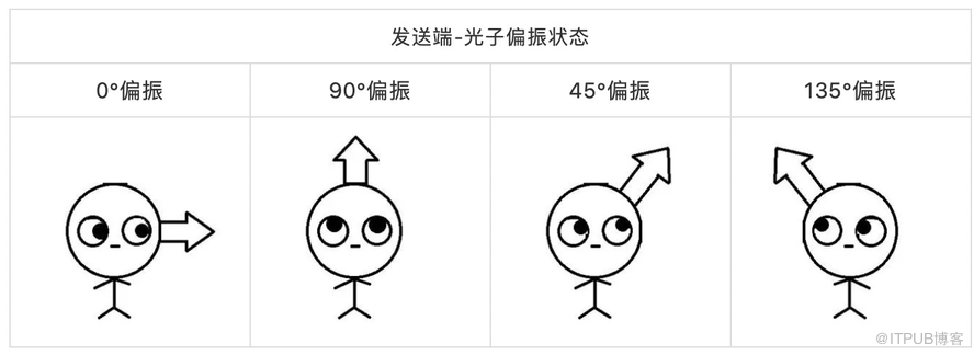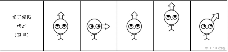 举一个例子来说明:卫星发送端随机发送一系列不同偏振状态的光子对,一组发送给A,一组发送给B。 为了便于理解,假设量子卫星发送给A、B两地的随机纠缠量子对偏振方向均如下: