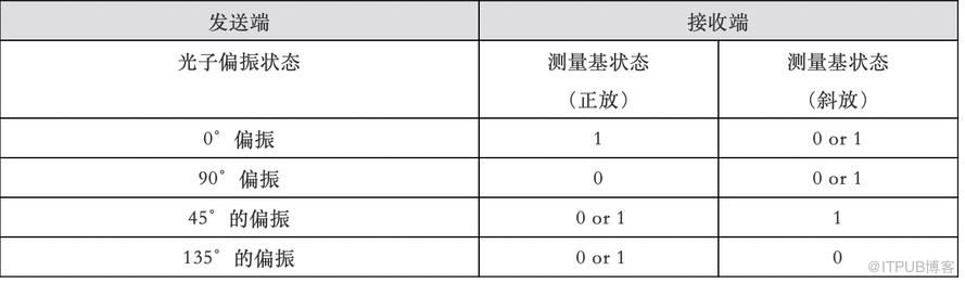 通过上图,可以看出: 0°偏振和90°偏振的光子只能被正放的测量基识别,如果遇到斜放的测量基,光子就不能被识别。45°偏振和135°偏振的光子只能被斜放的测量基识别,如果遇到正放的测量基,光子就不能被识别。那不能被识别咋办呢?只能“认倒霉”,并依靠量子的“神奇”特性—随机性进行随机分配了。 对于不能识别的偏振光子,会随机分配哪个代表0哪个代表1,这也恰恰为量子密钥超强保密性的“最强杀招”。