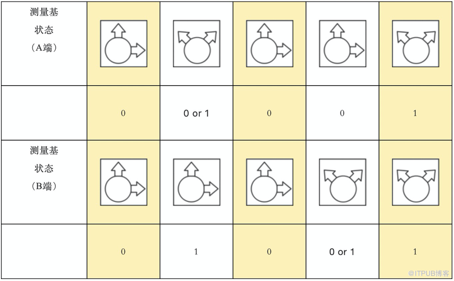 A、B接收端采用如下的随机测量基进行测量,可以分别得到: