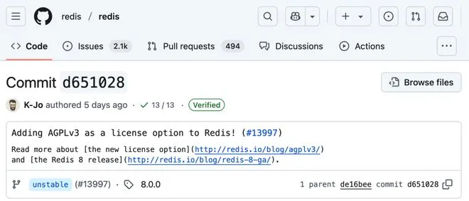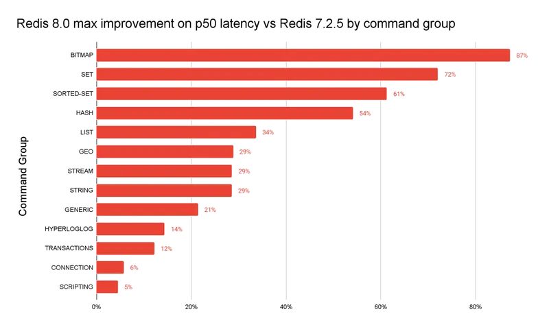 这确实是个好消息,因为之前的SSPL协议,完全就是个伪开源协议,被喷成狗。 另外,在新特性方面,给大家做个解读。 新的数据结构Redis 8.0新增了8种数据结构,分别是向量集合 (vector set)、JSON、时间序列,以及5种概率结构,包括布隆过滤器、布谷鸟过滤器、Count-min sketch、top-k 和 t-digest。 向量集合,这是服务器托管一种用于向量相似性搜索的新数据类型。由 Redis 的原始创建者 Salvatore Sanfilippo 开发,向量集借鉴了有序集(sorted set)的灵感,并扩展了有序集的概念,允许存储和查询高维向量嵌入,从而增强了 Redis 在涉及语义搜索和推荐系统等 AI 用例中的能力。向量集补充了 Redis Query Engine 中现有的向量搜索功能。 JSON,在 Redis 8 中,JSON 数据结构允许将 JSON 文档作为键存储在 Redis 中。Redis 提供了使用 JSONPath 语言检索和操作文档的命令,以实现对特定元素的更细粒度且高效的访问。Redis 还支持原子更新,因此可以修改 JSON 文档的某些部分,而无需先检索整个文档。 时间序列,时间序列简化了处理快速变化的带时间戳数据(如来自物联网传感器、系统遥测、股票价格、商品价格、外汇汇率和加密货币价格的数据)的用例。 概率性数据结构,概率性数据结构能够更快地处理关于数据流和大型数据集的常见问题。Redis 8.0新推出了有 5 种概率性数据结构。 Bloom filter和 Cuckoo filter用于检查给定值是否已在数据流中出现过 Count-min sketch用于估计给定值在数据流中出现的次数 Top-k用于查找数据流中最常见的值 t-digest用于查询数据流中有多少比例的值小于/大于给定值。 (其中Bloom filter以前也支持,但是要通过插件或者Redisson这种框架来实现。) 性能提升Redis 8 附带了个Query Engine,这个版本可以为哈希和 JSON 数据结构中存储的数据创建二级索引。 Redis Query Engine 最常见的用途包括向量搜索、按条件或标签返回精确匹配项的数据查询,以及按关键词或语义返回最佳匹配项的搜索查询。 Redis Query Engine可以通过两种新的方式进行扩展,官方实测可以通过水平(集群)和垂直(多线程)扩展,查询处理能力能提升 16 倍。 其次是命令执行速度大大提升,在 149 个基准测试中,90 个命令运行更快,延迟更低,最高的提升了87%。
