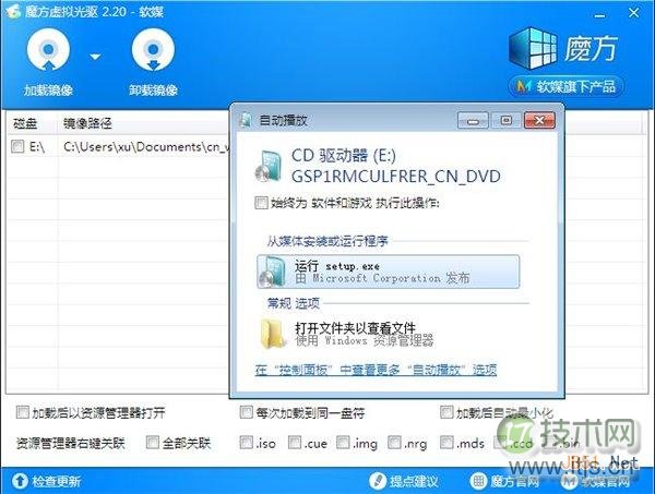 二、使用魔方虚拟光驱安装Windows 7双系统 1、根据上述一中的步骤,加载Windows 7系统盘镜像,在弹出的提示框中,直接选运行setup.exe这一项。