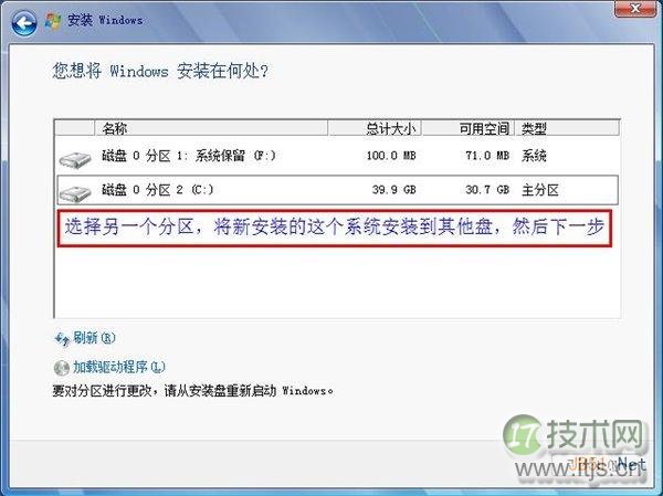 7、如下图提醒,在安装过程中选择安装在何处时,选择一个新的分区,确保不是覆盖安装。