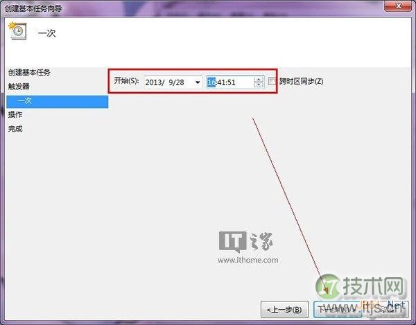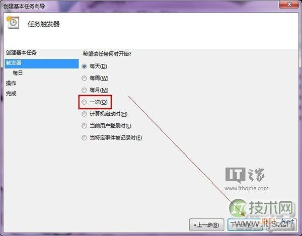 4、在任务触发器步骤中,选择任务触发机制:就像闹钟一样,你自己可以选择定时关机任务是b2b供应网每天按点启动,还是每周按点启动,或者是就执行这一次。本例选择了“一次”,就是说,定时关机任务执行一次关机后,任务就失效。
