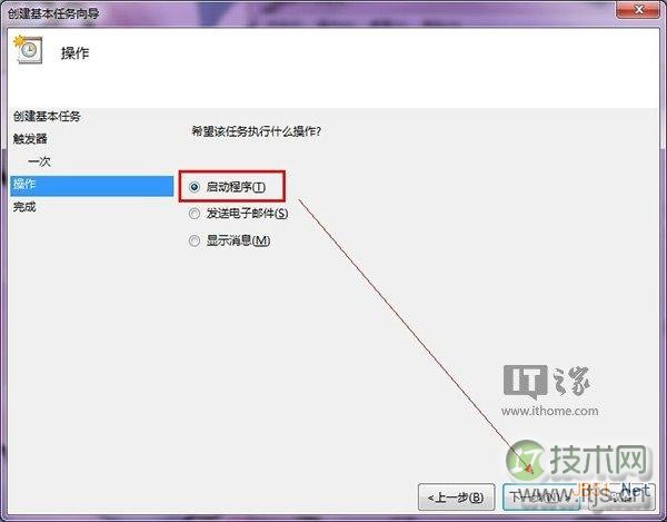 6、设置好时间后,就需要开始选择任务执行的动作。因为我们需要的是定时关机,所以在这里我们需要选择“启动程序”。源码下载假如你想让电脑定时发邮件,或者定时显示消息,就可以分别选择其余两项。