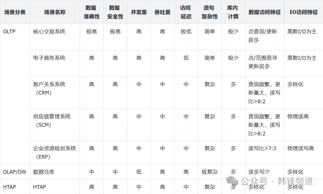 在架构层面,分布式在扩展性天然具备一定优势,当然针对绝大多数企业及场景来看,源码下载集中式共享模式提供的Scale Up能力,已经是可以满足的了。之前国内这种方案较少,大多还是主备,近两年部分厂商开始发力。在可用性、可靠性、容灾等方面,分布式具备的计算层无状态、存储层多副本架构等技术特点,成为可靠的保障。从我的观察来看,很多国内用户选择分布式数据库,很多往往不是因为计算、存储的规模问题,而是考虑了可用性问题。出于对国产数据库的各种不放心,天然会考虑通过分布式能解决一定问题。这有一定道理,但是这其实也是一柄双刃剑,分布式架构的复杂度也带来对可用性的挑战。其实经典的 IOE 架构,是之前企业的普遍选择,大部分核心业务系统是构建于此,只不过国产数据库此类架构发展较晚,大家还处于观望状态。 性能层面在性能层面,分布式同样具备一定的优势,可通过水平扩展计算节点来解决高并发、高吞吐的问题。这一点集中式之前方案不多,虽然单节点的处理能力已经达到上百万的TPMC,但是在极端场景下还是有所欠缺。共享存储的架构是另一种思路,可在一定程度上解决传统集中式架构的性能短板。之前有一点容易被忽略的是关于时延问题,分布式架构在这点上往往表现不佳,这主要是因为其层次多、路径长所导致的,这一点集中式架构是有一定优势的。 一致性层面在一致性方面分两点,一是数据一致性,即多个数据副本是否保障的实时一致性;一是读写一致性,可理解为读取的是否为最新版本的数据。这方面主要是数据副本的复制机制、复制粒度有关,强一致会带来不错的一致性表现,但对性能的影响也是巨大的。其实最好的一致性是数据不复制,对单一副本进行读写,集中式的共享存储模式就是这种,严格意义来讲也不是数据不复制,只不过数据副本的构建是在更低层次(存储)上解决了。 应用适配性在应用适配难度上,分布式的劣势就很明显了,其在架构设计、语句开发等方面不可避免地需要考虑分布式的特点。当然很多分布式厂商也都在解决这一问题,希望通过类似“透明分布式”的做法来屏蔽这一难点。但目前看来只能说在一定程度上可以解决,尚无法达到同集中式同等的设计、开发适配能力,毕竟过去几十年来研发人员已经习惯在集中式数据库上的设计开发了。此外,针对库内计算的问题则差异更大,这也是大家这些年都纷纷采用降低数据库计算要求,这其实也是无奈之举,但同时其背后的压力与成本付出则是更多人看不到的。 资源利用在资源利用方面,分布式所需组件多、资源消耗大,是很多人所诟病的,这是其架构决定的。约一体化的架构对资源的使用效率越高,这一点集中式有一定优势。在隔离性方面,同样如此,较为清晰的资源调用路径有利于提升隔离性,避免因资源消耗过大导致的异常蔓延问题。 综合成本最后的成本问题则来自多个方面,这包括了硬件、软件采购及与之相配套的开发测试与运营维护成本。这一点分布式具有的新架构、节点组件多、资源需求多、开发适配投入大、管理维护复杂等问题是存在的,这也在一定程度造成分布式推广难点,因而可见近年来很多分布式企业提供的单机一体化能力,就是为了在一定程度上减低部分成本。很多用户可能会有感觉,上了分布式后,比之前集中式的 IOE 架构还要贵,这点也为国产集中式架构产品带来一定启发,做出更具性价比的产品。 2. 典型业务场景分析上面谈到了数据库主流用法,那么用户又该如何去选呢?一方面可以参考表格内容做好自有业务分析,一方面也可以参考行业一些通用做法。这里引用来自白鳝老师近期发表的一篇文章,其中对主流业务场景做了抽象。这里将下面场景逐一分析,看用什么架构适配会更为合适。 1).典型业务场景回顾