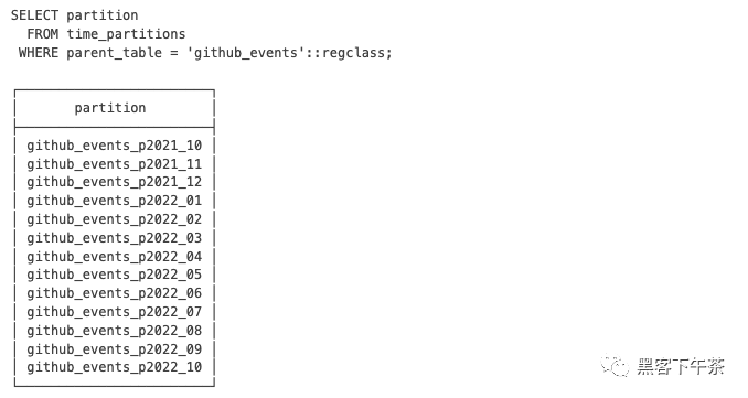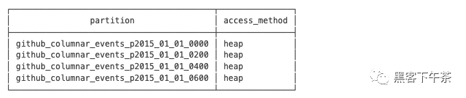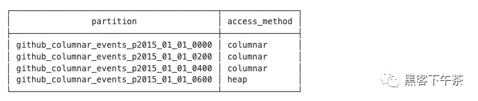 access_method FROMtime_partitions WHERE parent_table = github_columnar_events::regclass;1.2.3.4.5.6.7.8.9.10.11.12.13.14.