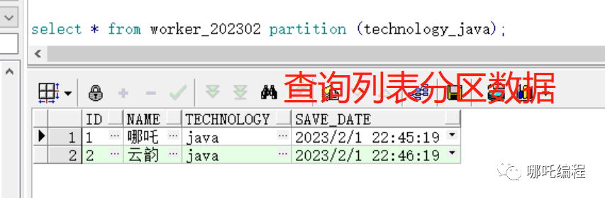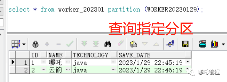 , SYYYY-MM-DD HH24:MI:SS, NLS_CALENDAR=GREGORIAN));1.2.3.4.5.6. (6)删除分区 复制ALTER TABLE worker_202301DROP PARTITION WORKER20230131;1.2. 2、列表分区(1)列表分区适用于一个字段只有「固定」的几个值,比如类型、月份、课程等。 复制create table WORKER_202302( id VARCHAR2(100) not null, name VARCHAR2(200), technology VARCHAR2(100), save_date DATE) partition by list (technology) ( partition technology_java values (java), partition technology_python values (python), partition technology_c values (c) ); create index IDX_WORKER_ID202301 on WORKER_202301 (ID) local; create index IDX_WORKER_ID_NAME202301 on WORKER_202301 (ID, NAME) local;1.2.3.4.5.6.7.8.9.10.11.12.13.14.15.16.17.18. (2)插入三条数据 复制insert into worker_202302 (id,name,technology,save_date) values (1,哪吒,java,to_date(2023/2/1 22:45:19,yyyy-MM-dd hh24:mi:ss)); insert into worker_202302 (id,name,technology,save_date) values (2,云韵,java,to_date(2023/2/1 22:46:19,yyyy-MM-dd hh24:mi:ss)); insert into worker_202302 (id,name,technology,save_date) values (3,美杜莎,python,to_date(2023/2/2 00:45:19,yyyy-MM-dd hh24:mi:ss));1.2.3. (3)查询列表分区数据