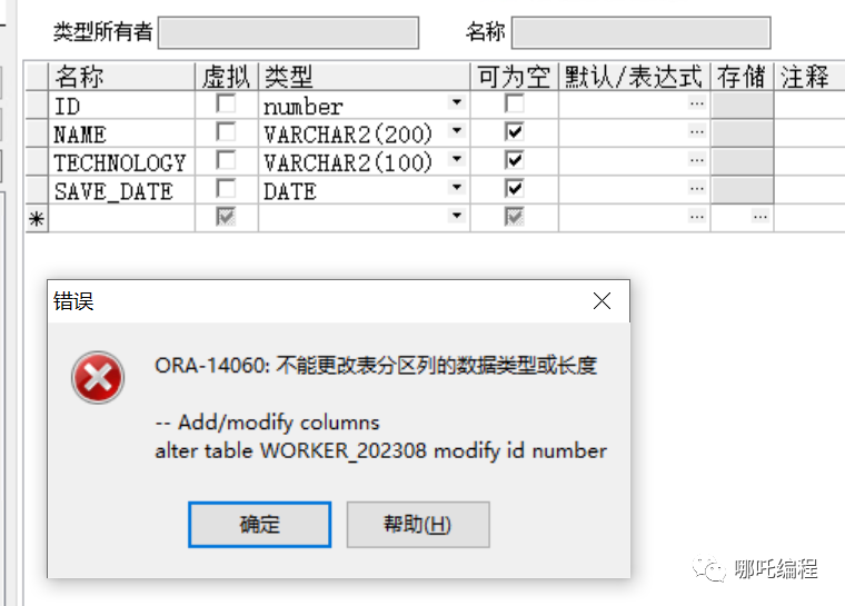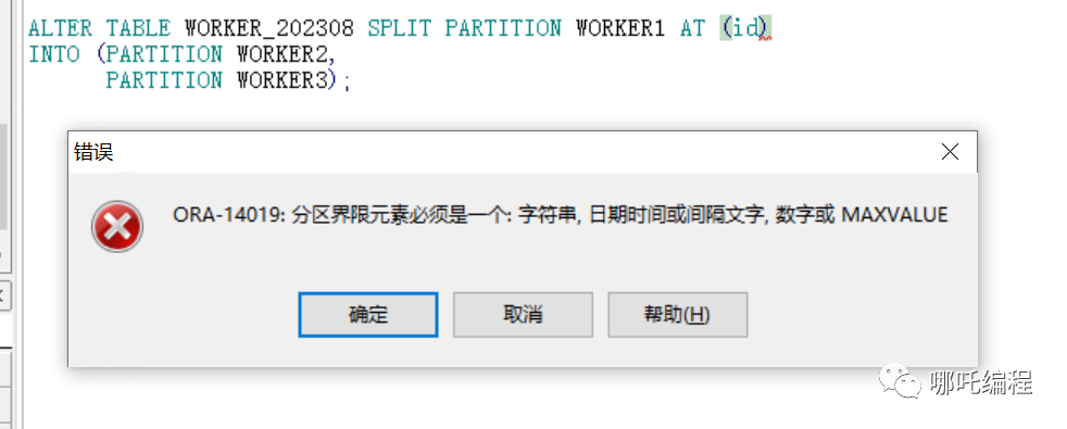 AT括号内不能是字段名称,改为数字即可。 复制ALTER TABLE WORKER_202308SPLIT PARTITION WORKER1 AT (180) INTO (PARTITION WORKER2,PARTITION WORKER3);1.2.3.注意:不能修改分区列的数据类型
