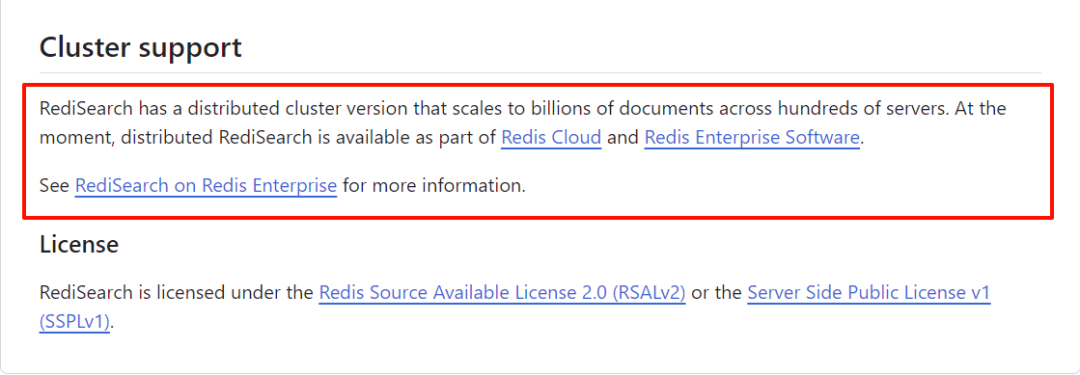 RediSearch 官方更新频率图 最近一次提交记录在 12 月 17 号。 可以看到 RediSearch 的更新频率还是比较高的,而且是官方支持做的模块,不用担心后续无人维护。 虽然 Redis 天生支持分布式集群,但是 RediSearch 对 Redis 集群的支持还不完善,引用官方说明,