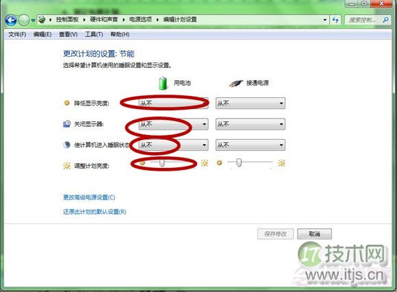 3、制定电源计划 假如电池使用笔记本时,你一定希望电池可以使用的时间更长。Windows 7中新增的“电源计划”很好的解决了这个问题。你可以在右键单击“电源”的图标,就可以进行“选择电源计划”中的“节能”,就可以通过调整“亮度”等选项,延长电池的待机时间,再点击“保存修改”。每次调整你都可以查看自己电源还剩多少时间,以求达到你的使用时间。但是,假如你有有电源的情况下,就要选择“平衡”了,这样电脑的流畅性更好。