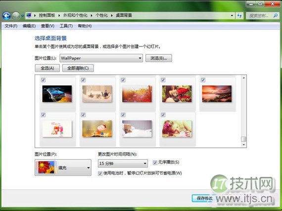7、桌面播放幻灯片。 你可以通过设置,用幻灯片播放方式更换自己的桌面背景。右键“桌面”选择“个性化设置”中点击“桌面背景”按住“Ctrl”键可以同时选择几张图片,你还可以设置图片的时间间隔和播放方式。