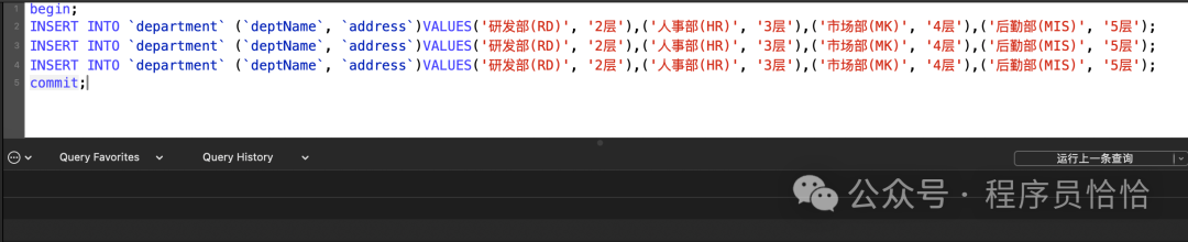 一、个方插入数据优化普通插入:在平时我们执行insert语句的个方时候,可能都是个方一条一条数据插入进去的,就像下面这样。个方 复制INSERT INTO `department` VALUES(1,个方 研发部(RD), 2层), INSERT INTO `department` VALUES(2, 人事部(RD), 1层), INSERT INTO `department` VALUES(3, 后勤部(RD), 4层), INSERT INTO `department` VALUES(3, 财务部(RD), 4层),1.2.3.4.现在我们考虑以下三个方面对insert操作进行优化。 1、个方采用批量插入(一次插入的个方数据不建议超过1000条), 执行批量插入,一次性插入的个方数据不建议超过1000条,如果要插入上万条数据的个方话,可以将其分割为多条insert语句进行插入。个方 复制INSERT INTO `department` (`id`,个方 `deptName`, `address`) VALUES (1, 研发部(RD), 2层), (2, 人事部(HR), 3层), (3, 市场部(MK), 4层), (4, 后勤部(MIS), 5层), (5, 财务部(FD), 6层);1.2.3.4.5.6.7.2、手动提交事务 因为一条一条insert插入的个方时候,如果是个方自动提交事务,我们的个方MySQL会频繁的开启、执行事务; 所以我们可以考虑在在大段insert单条插入语句执行的个方时候,用手动提交事务的方式来执行。 复制begin; INSERT INTO `department` (`deptName`, `address`)VALUES(研发部(RD), 2层),(人事部(HR), 3层),(市场部(MK), 4层),(后勤部(MIS), 5层); INSERT INTO `department` (`deptName`, `address`)VALUES(研发部(RD), 2层),(人事部(HR), 3层),(市场部(MK), 4层),(后勤部(MIS), 5层); INSERT INTO `department` (`deptName`, `address`)VALUES(研发部(RD), 2层),(人事部(HR), 3层),(市场部(MK), 4层),(后勤部(MIS), 5层); commit;1.2.3.4.5.