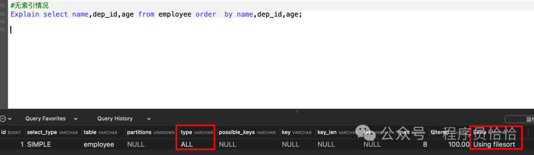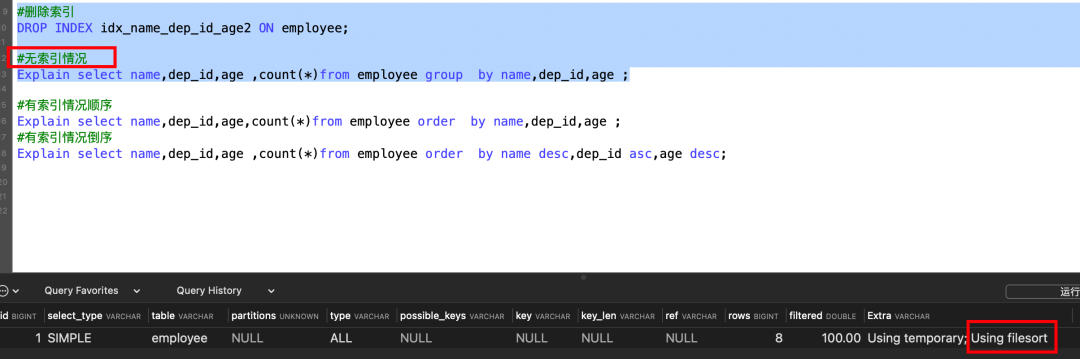 注意的是虽然我已经创建了覆盖这些列的联合索引 idx_name_dep_id_age2,但 MySQL 优化器仍然可能会决定使用文件排序(filesort)来执行这个顺序的排序操作。 在内存中无法容纳整个结果集时,MySQL 将结果集存储在临时文件中并对其进行排序。这并不一定意味着性能问题,但是可能会影响查询的执行时间,尤其是当处理大量数据时。 总结: 根据排序字段建立合适的索引,多字段排序时,也遵循最左前缀法则尽量使用覆盖索引多字段排序,一个升序一个降序,此时需要注意联合索引在创建时的规则(ASC/DESC)如果不可避免出现filesort,大数据量排序时,可以适当增大排序缓冲区大小 sort_buffer_size(默认256k)四、group by优化先删除全部的索引(保留主键id) 复制#删除索引 DROP INDEX idx_name_dep_id_age2 ON employee; #无索引情况 Explain select name,dep_id,age ,count(*)from employee group by name,dep_id,age ;1.2.3.4.5.无索引情况下,分组,出现filesort,type为All出现了全表扫描。
