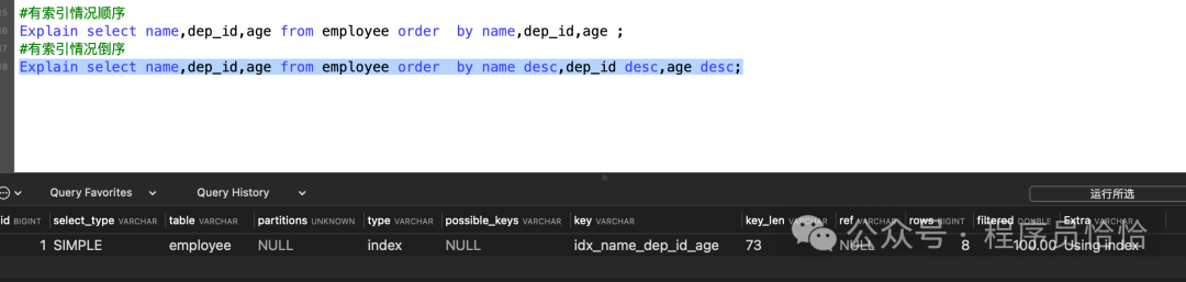 新建联合索引:name,dep_id,age 复制#创建联合索引 CREATE INDEX idx_name_dep_id_age ON employee (name, dep_id, age); #查询当前索引 show INDEX from employee #删除索引 DROP INDEX idx_name_dep_id_age ON employee;1.2.3.4.5.6.7.如果order by字段全部使用升序排序或者降序排序,则都会走索引.