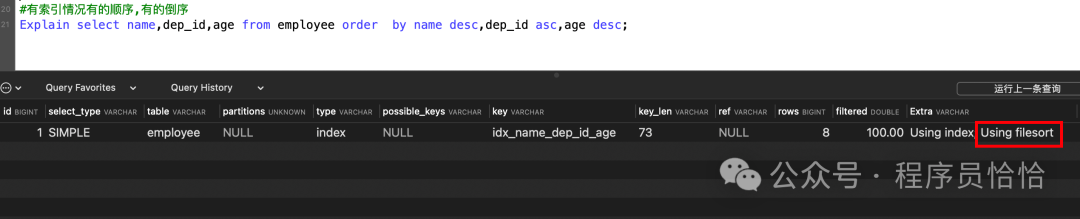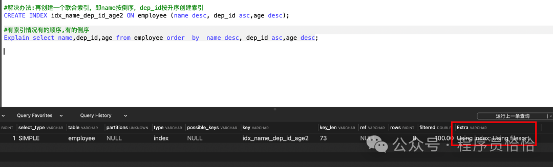如果要优化掉Using filesort,此时我们可以再创建一个联合索引,即name按倒序,dep_id按升序创建索引,就可以解决。