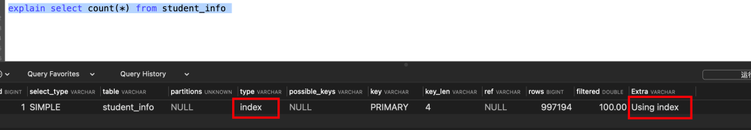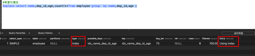 新建联合索引,name,dep_id,age再观察。 复制#创建联合索引 CREATE INDEX idx_name_dep_id_age ON employee (name, dep_id, age); #有索引情况 Explain select name,dep_id,age,count(*)from employee group by name,dep_id,age ;1.2.3.4.5.可见用到了索引