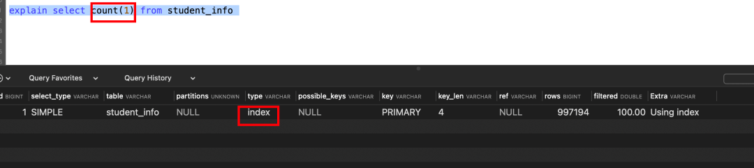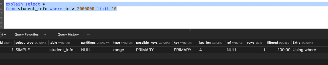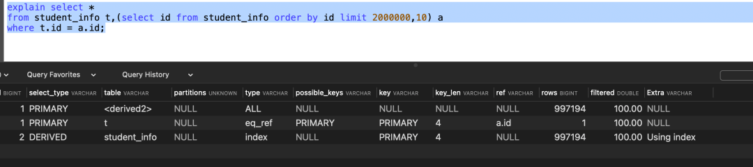总结: 在分组操作时,可以通过索引来提高效率分组操作时,索引的使用也是满足最左前缀法则的如索引为idx_user_pro_age_stat,则句式可以是select ... where profession order by age,这样也符合最左前缀法则 五、limit优化语法复习: 复制#0表示起始位置,10表示每一页展示的数据。 select * from student_info limit 0,10;1.2.这条查询执行的速度非常快,但是如果我们将起始位置设置为100000呢? limit分页查询在大数据量的时候,查询效率同样会非常的慢,例如一个常见又非常头疼的问题就是limit 2000000,10 此时需要MySQL排序前200010条记录,仅仅返回200000-2000010的记录,其他记录丢弃,查询排序的代价非常大。 优化方案:一般分页查询时,通过创建覆盖索引能够比较好地提高性能,可以通过覆盖索引加子查询形式进行优化 例如:利用主键id,先获取要查询的10是个id. 复制explain select * from student_info t,(select id from student_info order by id limit 2000000,10) a where t.id = a.id;1.2.3.