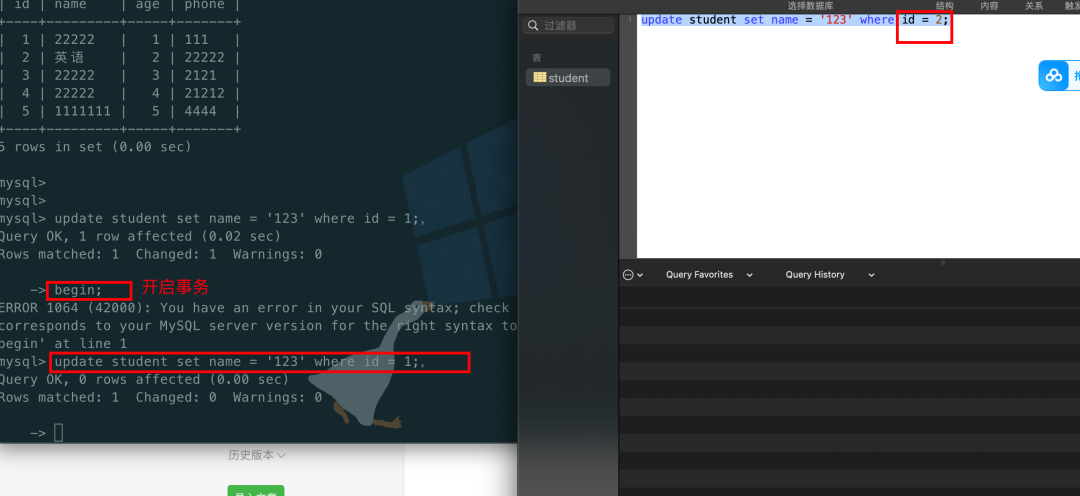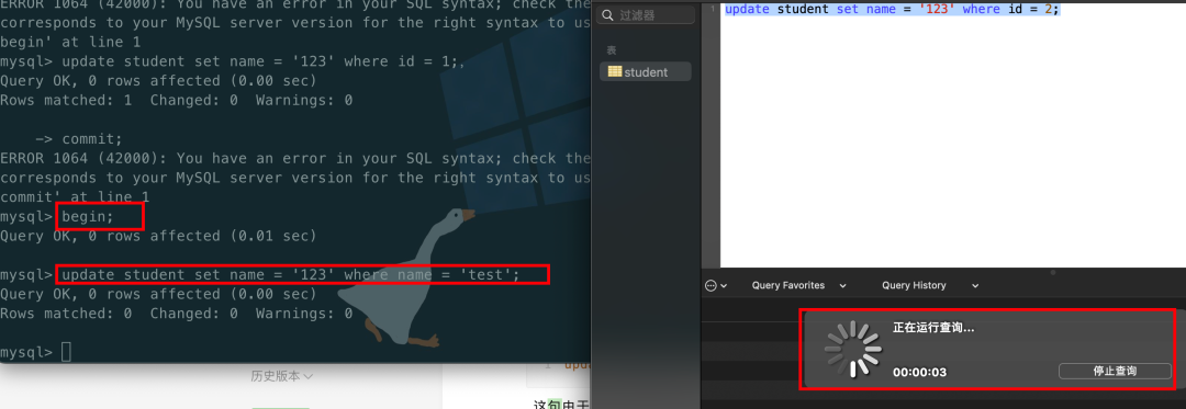 会话1: 复制update student set name = 123 where id = 1;1.由于id有主键索引,所以只会锁id = 1这一行; 会话2: id=2,当然会立马执行结束,不用等待会话1提交事务 复制update student set name = 123 where id = 2;1.测试2: 开启两个会话:更新student表的数据,会话1更新name(name字段无索引)为2的数据,会话2更新id为2的数据 复制update student set name = 123 where name = test;1.