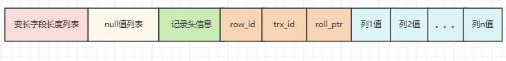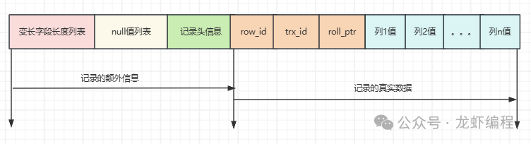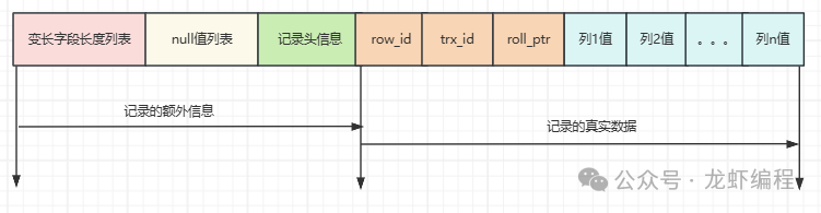 (1)delete_mask:标识此条数据是否被删除。从这里可以知道,我们执行detele删除记录的时候,并不会真正的删除记录,只是将这个记录的delete mask标记为1。 (2)next_record:下一条记录的位置,记录与记录之间是通过链表组织的。 (3)record_type:表示当前记录的类型,0表示普通记录,1表示B+树非叶子节点记录,2表示最小记录,3表示最大记录。 (4)预留位1 (1 bit):该位暂时未被使用。 (5)预留位2(1 bit):该位暂时未被使用。 (6)min_rec_mask (1 bit):B+树的每层非叶子节点中的最小记录都会添加该标记。如果是最小记录,则该位为1;否则为0。 (7)n_owned(4bits):表示当前记录拥有的记录数。使用4个bits来表示,可以表示的最大值为15。 (8)heap_no (13 bits):表示当前记录在记录堆中的位置信息。使用13个bits来表示,可以表示的最大值为8191。 4.4 记录的真实数据记录真实数据部分除了我们定义的字段,还有三个隐藏字段,分别为:row_id、trx_id、roll_pointer,如下图所示: