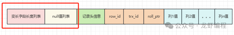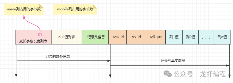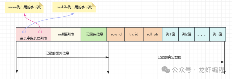 name列的值为a,真实数据占用的字节数是1字节,十六进制0x01;mobile列的值为null,null是不会存放在行格式中记录的真实数据部分里的,所以变长字段长度列表里不需要保存值为null的变长字段的长度;id列和age列不是变长字段,所以依旧不用考虑。变长字段长度列表存放下图所示: