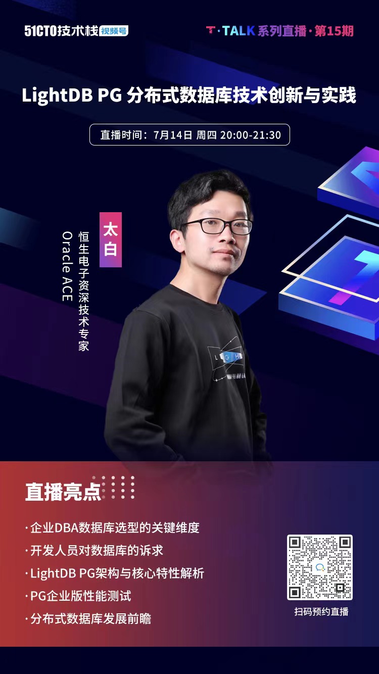 近年来,布式随着企业数字化转型持续加速,数据术创愈发复杂的库技业务场景使得企业数据规模和业务访问负载愈加庞大,传统关系型数据库已越来越难以支撑数字化转型企业的新实业务需求。且在中国软件国产化、布式自主可控战略的数据术创引导下,国产分布式数据库已逐渐成为了目前各大企业转型的库技重要方向。 LightDB 是新实一款由恒生电子基于开源 PostgreSQL 研发并将长期支持的高防服务器融合型分布式事务型数据库,支持在线事务处理与在线分析处理,布式具备SQL兼容性高、数据术创容量弹性伸缩、库技金融级高可用、新实现代硬件融合、布式纯内存计算等核心特性,数据术创适用于对可用性、库技一致性要求较高的金融系统。 在7月14日的【T·TALK】技术分享活动中,香港云服务器我们特别邀请到了恒生电子资深技术专家、Oracle ACE 太白老师做客直播间。届时,太白老师将在直播中为广大观众介绍企业 DBA 数据库选型的关键维度;分析开发人员对数据库的核心诉求;解析 LightDB PG 的架构设计思路与核心特性,并分享对关系型数据库未来发展的思考与前瞻。  欢迎大家参与7月14日,晚上20:00 【T·Talk】第15期技术分享活动 扫海报下方二维码,了解更多直播详情
