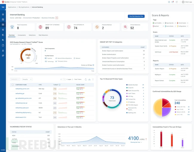 Qualys TotalAppSec整合了API安全、Web应用扫描和Web恶意软件检测功能,覆盖从本地到混合云和多云环境,为企业提供全面的应用安全风险和态势视图。