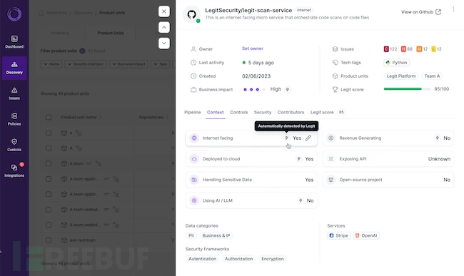 Legit Context通过构建带有上下文的应用目录,为企业提供全面的视角,包括敏感数据使用、API、互联网暴露、生成式AI应用、合规影响以及应用在业务中的整体角色。