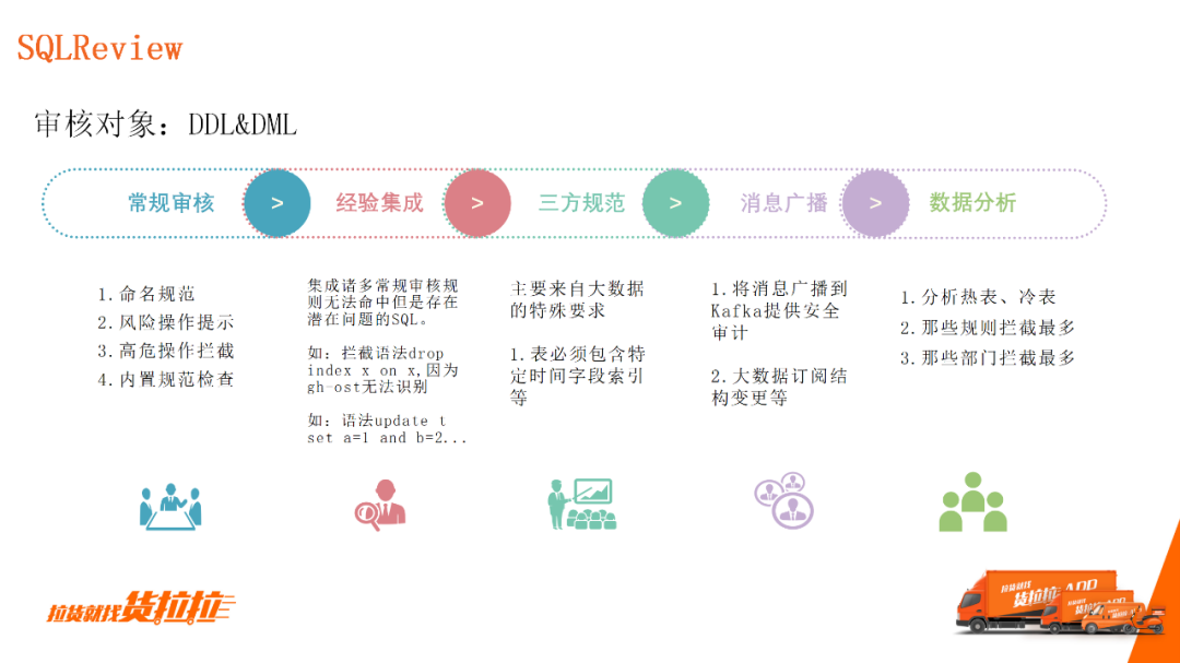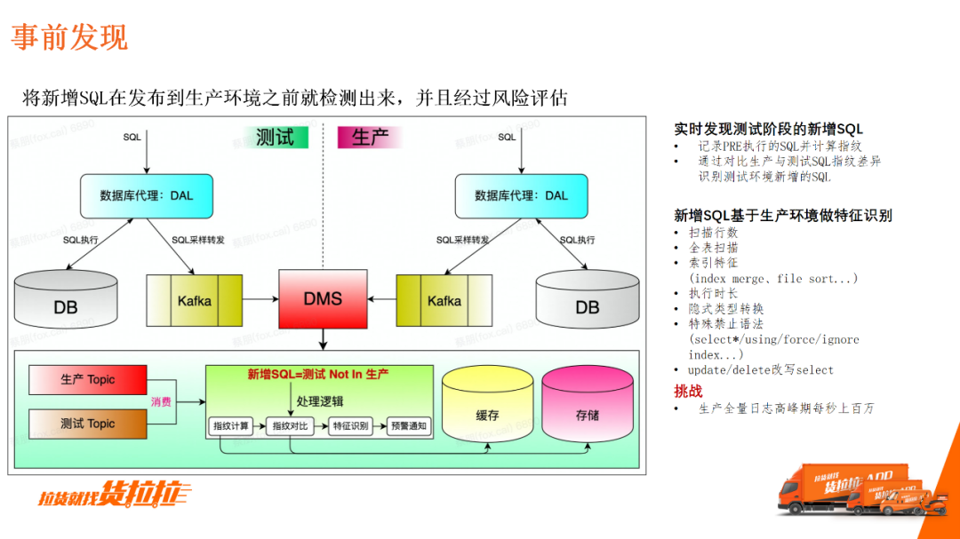SQLReview是在开发环境向测试环境或生产环境发布时,对语句进行基本审核。此部分的整体能力建设与当前业界主流的开源没有太大差别,只是我们的b2b信息网集成规范会更个性化或更丰富。 第一,根据DBA在日常中的反馈,完善相应规则并集成经验,如拦截特殊语法; 第二,集成三方规范。比如大数据包含某些特殊要求,要求每一张表必须有时间字段等特定字段、特定类型和特定索引,以供大数据抽取数据; 第三,广播变更消息,比如提供安全审计,变更大数据订阅结构变更; 第四,日志分析,分析热点表。DBA在日常运维时,需要一定数据统计来总结经验,梳理重点关注的业务,了解拦截最多的规则和问题最多的部门。 2)新增SQL检测新增SQL检测是指在SQL执行到生产环节之前,将它拦截。实现流程中最重要的一点是,通过数据库代理中间件记录全量测试及生产的全量SQL、然后统一进行消费处理,识别出生产环境新增的网站模板SQL。