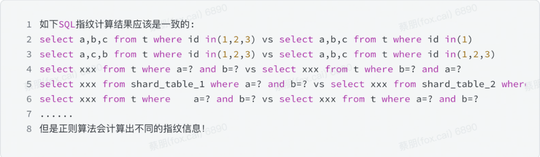 二是指纹计算。上述SQL通过DBA直观去看,指纹计算应该是一致的。但由于早期我们采用开源的基于正则的SQL指纹计算库存在的不足,无法识别SQL在细微上的差异,导致指纹计算准确度差影结果判断。 改进后的指纹算法则采用语法解析树的方式,将SQL的关键对象抽取出来做特征处理,比如取出查询字段后做排序后再计算指纹,对where条件同样做排序处理,防止sharding表由于表名字不同,造成的计算差异同样进行特殊处理。 3)统计分析