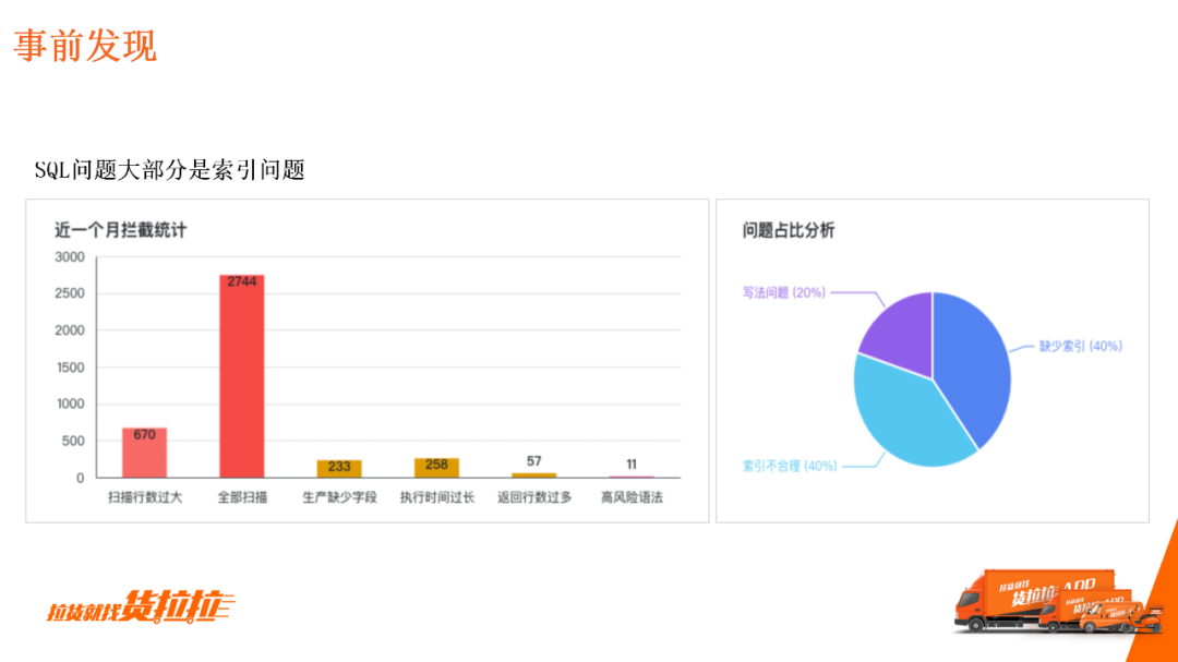 我们统计了最近一个月的拦截量。在TP场景下,SQL问题大部分是索引问题,由上图可知,“索引不合理”和“缺少索引”的情况占比之和达到80%。因此能否通过技术手段进行自动合理索引创建就是解决问题的重点。 4)研发视角新增SQL质量报告