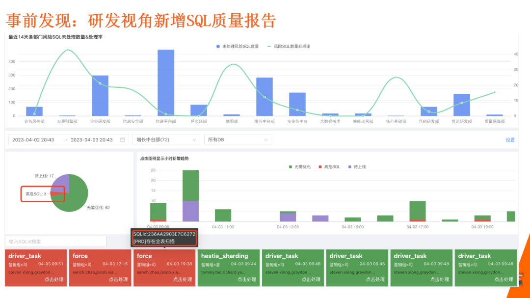 通过上图视角,研发可以了解每个DBA或每个部门,在具体时间范围内新增哪些 SQL,发到生产的新增SQL是否高危SQL,并清晰地记录下来。