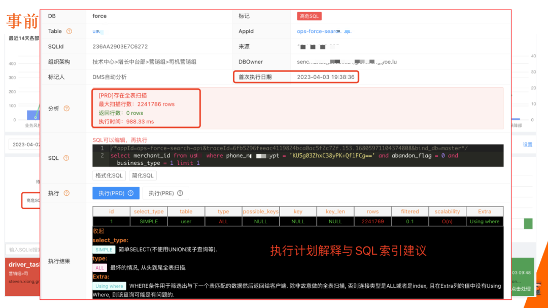 质量报告还包含其他重要信息,比如 SQL被认定为高风险的原因。如上图所示,质量报告提示可能存在全表扫描的情况,然后记录其首次出现的时长和时间,使用开源索引工具给出基本建议。 但初期的建设还不太完善,开源工具仅基于单条SQL提出建议,缺少评估意见合理性的全局视角,我们后续会整体改写这部分。 5)不带隐患上生产