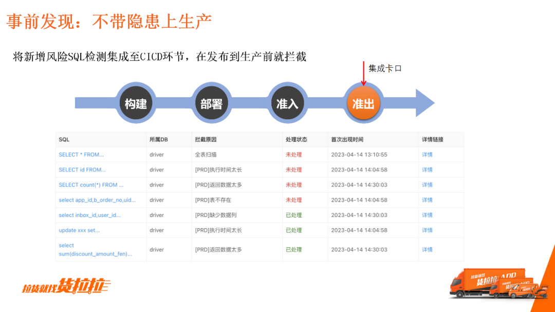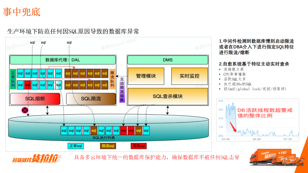 实现拦截功能需要与整个研发流程结合。 在CICD环节的准出阶段进行卡口集成,若出现高风险的慢查询或SQL没有处理的情况,会提示“不可上线”,避免隐患SQL上生产。 3.事中兜底无论防御做得多好,随着数据库容量、QPS的增长,一些SQL会不可避免地逐步恶化为慢SQL,因此要具备兜底能力。 第一,通过中间件进行主动或被动的SQL限流或熔断,比如DBA会主动介入对某个SQL限流或者熔断; 第二,自研数据库管控平台。平台集成数据库自愈系统,通过查杀模块,实时检测每一个数据库实例的健康状况,并根据特征进行相应的SQL查杀等。