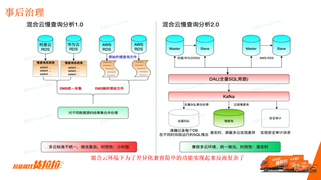 事后治理主要是慢查询治理。由于混合云上要兼容产品比较多通过云商接口,拉文件的原始分析方式实现比较麻烦,具备全量SQL的能力后实现就较为简洁,后续接入多家云或兼容MySQL协议的产品时,能更好实现慢查询分析、分析及安全审计等能力。 使用单一云较为简单,而在混合云上时,为了某一能力的统一化或标准化,就不得不把管控系统设计得很复杂。 5.后续计划