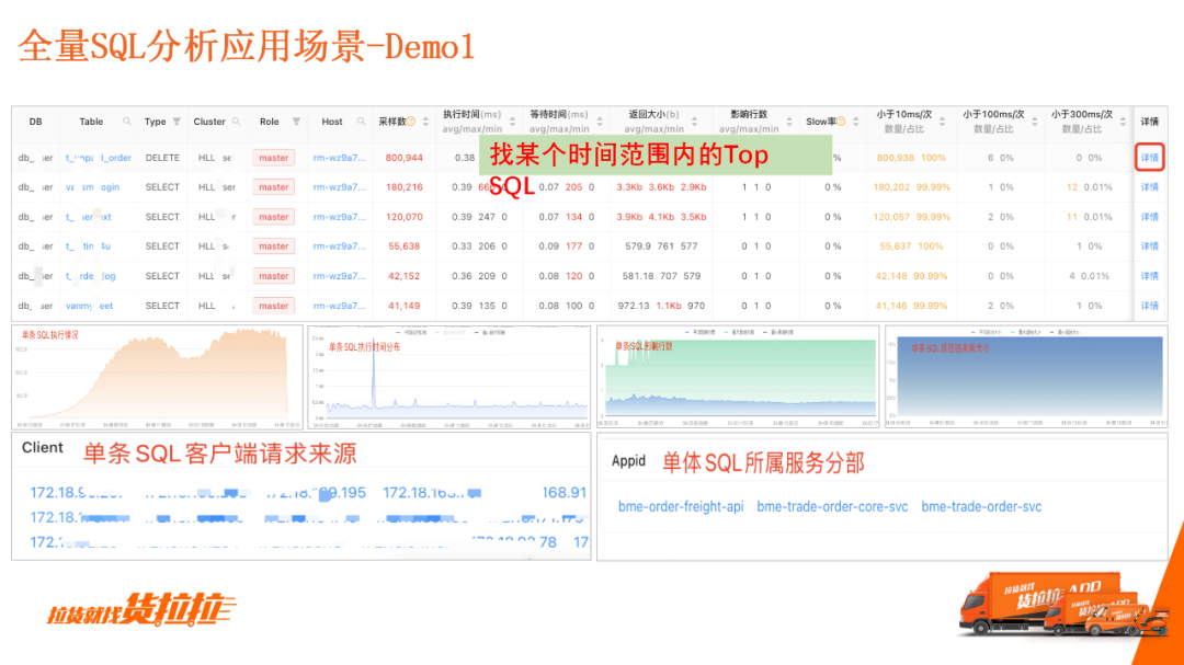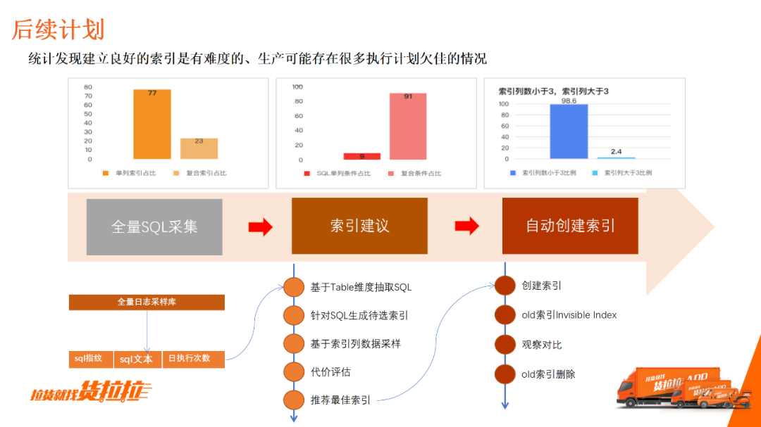 前文提到,我们统计80%的SQL问题是索引问题。如上图统计,生产环境中单列索引占比77%,复合索引只占了13%,同时复合查询条件占比91%。由此可以看出,用23%的复合索引服务91%的复合查询显然是不够的,意味着可能是存在很多SQL执行计划不佳的情况。 过去的开源建设是针对单个索引、单个SQL的最佳推荐,但具备了全量SQL采集分析能力后,可以做全局性最佳索引的推荐。在数据统计维度,可以基于代价进行评估给出整张表综合索引的建议,进而自动创建和维护索引。 二、深度观测:全量SQL分析与挖掘1.为什么要做全量SQL分析?