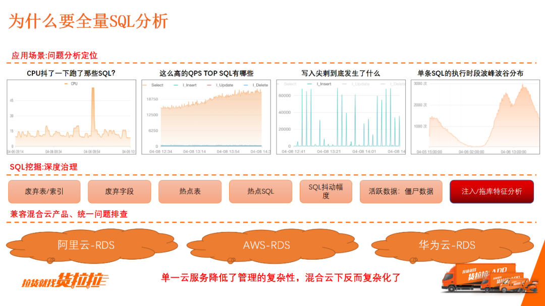 全量SQL的应用场景比较多。如上图所示,例如数据库CPU很高或抖了一下是哪些SQL导致的,这些SQL的具体执行情况,包括时间响应、返回行数、扫描行数等。 2)SQL挖掘:深度治理基于全量SQL分析表、索引是否已废弃,不同db的热点表、热点SQL,单条SQL RT是否稳定,甚至可以分析表的活跃数据情况等治理场景。 3)兼容混合云产品、统一问题排查由于混合云产品的差异性与企业统一管理的矛盾,给问题分析或日常应用带来很大困扰,因此产品设计时要格外考虑多云兼容性。 有时候,单一云确实提升了某一能力,但混合云下,服务整体功能的设计更加复杂。 2.全量SQL分析实现