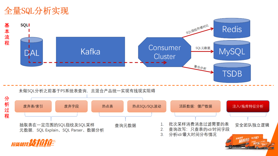全量SQL分析实现的基本流程:SQL请求DAL之后,DAL将SQL转发到Kafka里面,然后再根据业务场景需要进行消费处理。 比如分析某一个字段是否有在用,只需要通过指纹去重,抓取这一段时间内所有这个表的SQL请求,并进行参数解析,就能轻易分析出所需要的字段。 还比如热点表、热点SQL、SQL波动,经过先前处理后,可直接通过原数据查询。 通过对一段时间内的SQL查询返回数据记录,分析出活跃数据量占比,来指导研发合理的规定设置。