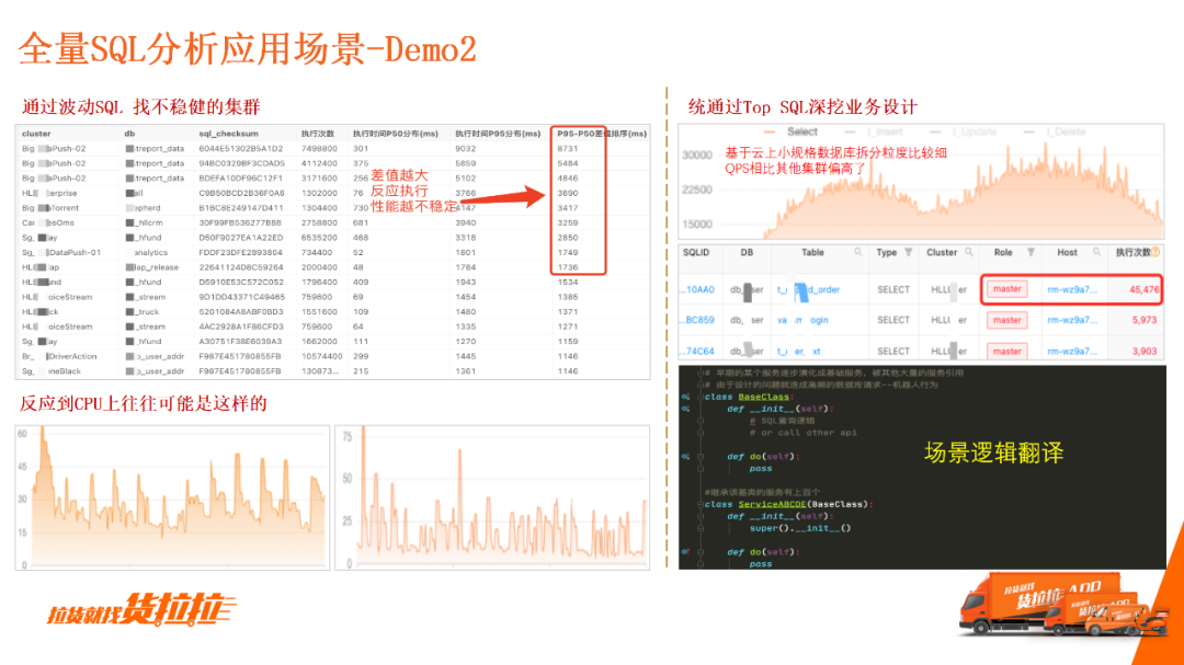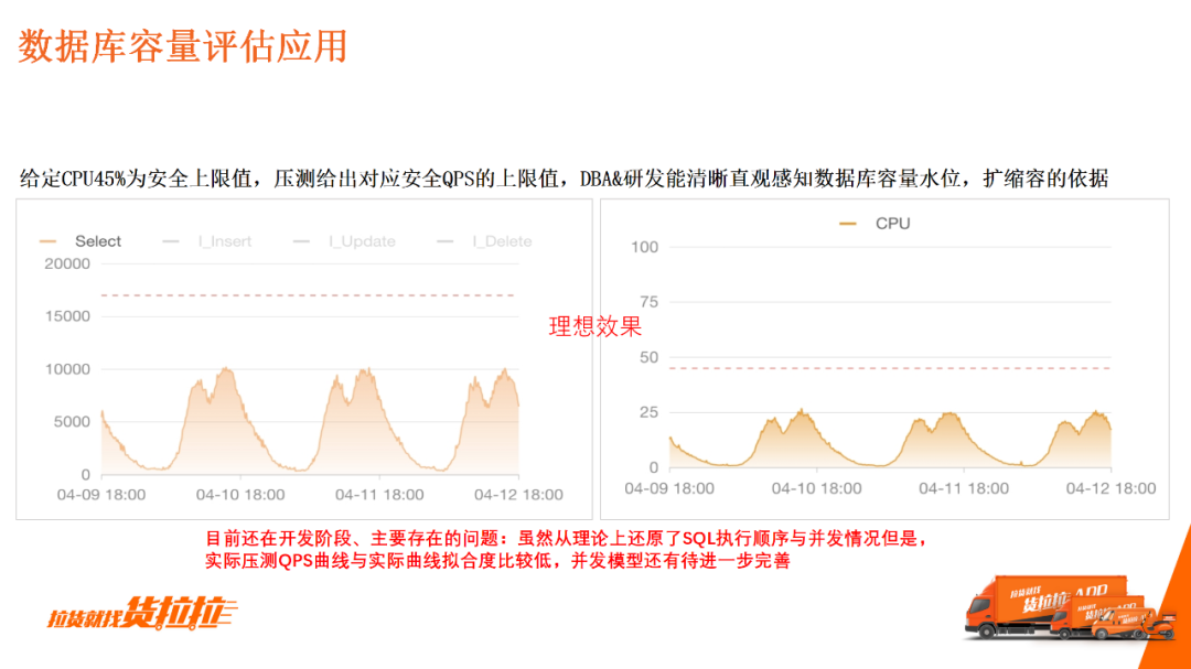 上图是第二个应用场景,通过波动SQL,查询不稳定集群。预处理每条SQL时,我们记录了SQL RT 的p50跟p95时长,把每一个集群下每一条SQL的p95跟p50去做差,然后聚合、排序。波动越大,聚合的差值越大,就大致能推测这个集群是不稳定的。 从上图左下方的图表可知,它的CPU经常具有毛刺。但日常中DBA很难根据经验照顾到每一个集群,所以需要拉取这些数据进行分析或日常治理。 再如DBA发现某个DB TOP 1的SQL执行的次数几乎是TOP 2的10倍,分析这个SQL发现它是一个司机登录场景。由于活跃的司机体量是有限的,司机登录动作达到每秒几万,这显然是不合理的。 与研发沟通后,我们找到了原因:这是典型的业务设计问题,也是一个基础编码问题。 三、容量预测:数据库仿真流量测压1.数据库容量评估